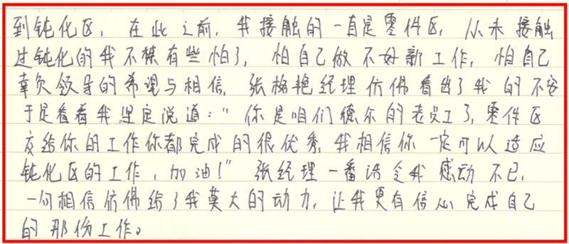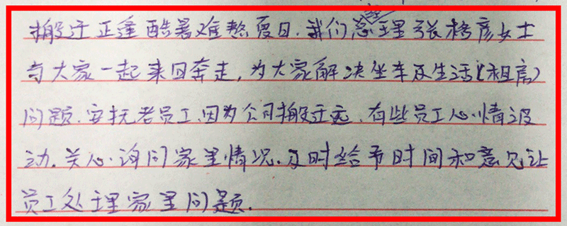 她的工作采購滿足生產(chǎn)、銷售的需求,還要注意采購原材料的質量,如果質檢發(fā)現(xiàn)質量有問題,要隨時進行溝通。而張格彥總經(jīng)理關心各部門的大小事情。例如:采購的原料不合適,她比她還著急催。生產(chǎn)的話,貨生產(chǎn)不出來,銷售供應不上,客戶就不需要咱們公司的貨了,銷售額上不去了,她也操心。大到銷售額,小到用電安全、節(jié)約,人走了是否關燈、關空調。不只是節(jié)約,也是安全的問題。像電沒關,著火了怎么辦?這才是大事情。